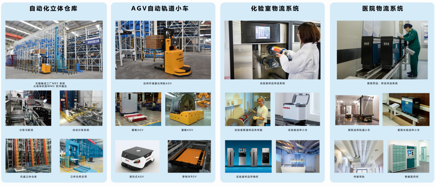 智能装备: 自动化立体仓库、AGV自动轨道小车、化验室物流系 统、医院物流系统